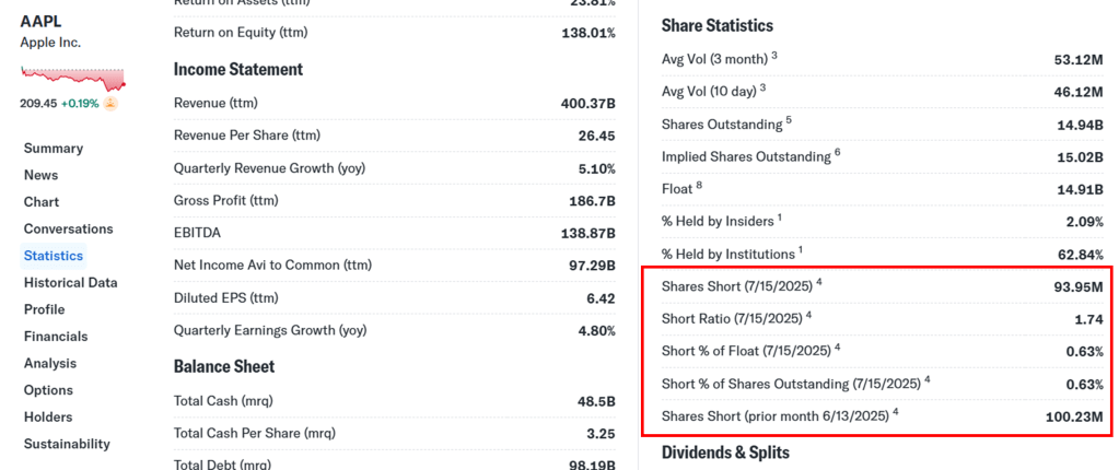 O metodă simplă și gratuită este utilizarea platformei Yahoo Finance. Procesul este ușor: se caută simbolul acțiunii (de exemplu, AAPL pentru Apple), se accesează pagina companiei, apoi se selectează secțiunea „Statistics”. Acolo, la subsecțiunea „Share Statistics”, pot fi consultate mai multe date relevante privind short interest-ul.